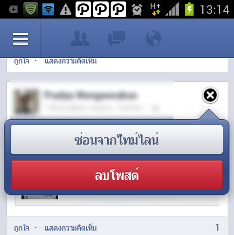สำหรับ Android ก็ทำคล้ายๆกัน โดยใช้นิ้วมาแตะค้างตรงข้อความโพสที่คุณอยากลบ แล้วเลื่อนนิ้วไปทางซ้าย แต่จะปรากฏเป็นเครื่องหมาย x ตรงมุมขวาบนของข้อความโพส ให้นำนิ้วมาแตะที่ x อีกที
