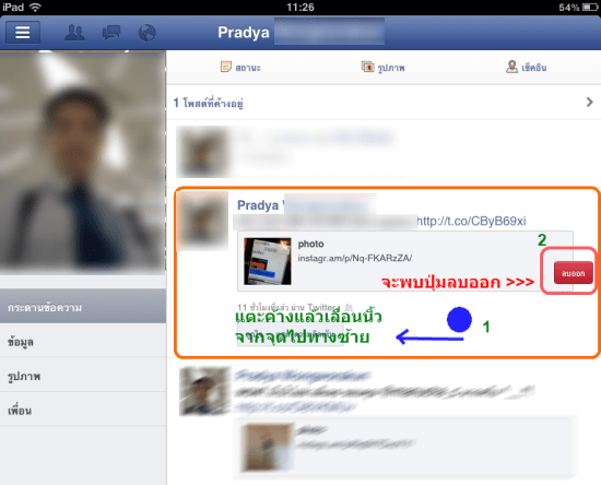 จากนั้นหาข้อความโพส ที่คุณต้องการลบออกจากโปรไฟล์ตัวเอง หรือ หาข้อความที่คุณต้องการลบแท๊คโฆษณาที่เพื่อนแท๊คหาเรา เมื่อพบแล้วให้นำนิ้วมาแตะค้างที่ข้อความโพสที่คุณอยากลบ แล้วเลื่อนนิ้วไปทางซ้าย จะปรากฏปุ่ม “ลบออก” แล้วคุณก็แตะปุ่ม ลบออก ได้เลย แค่นี้ข้อความก็จะถูกลบเรียบร้อย